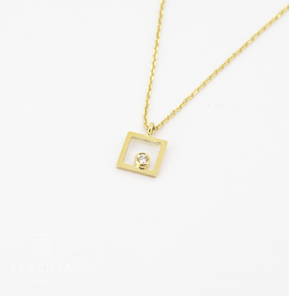 | Beschreibung: | Halskette aus 14 Karat Gelbgold mit einem Brillanten (0,02 ct.) Seitenlänge 4-Eck: 6 mm |