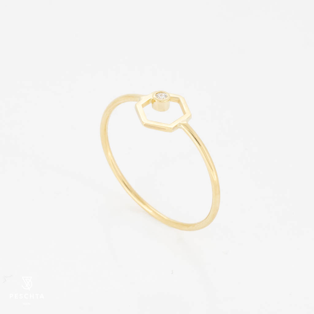 | Eigenschaften: | 6 – Eck Ring aus 14 Karat Gelbgold, gefasst mit einem Brillanten 0,02 Karat |
