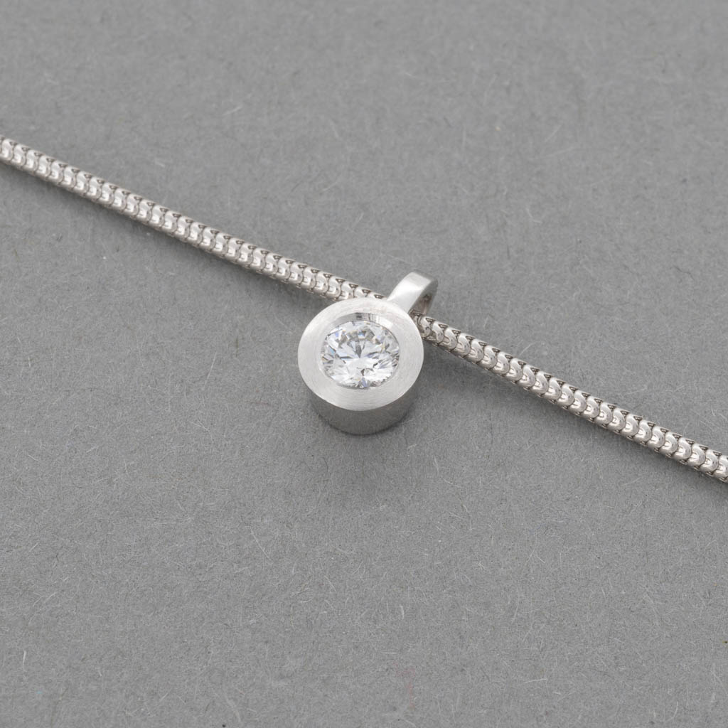 Runder Anhänger aus 14 kt. Weißgold matt mit 1 Brillant 0,12 ct.
