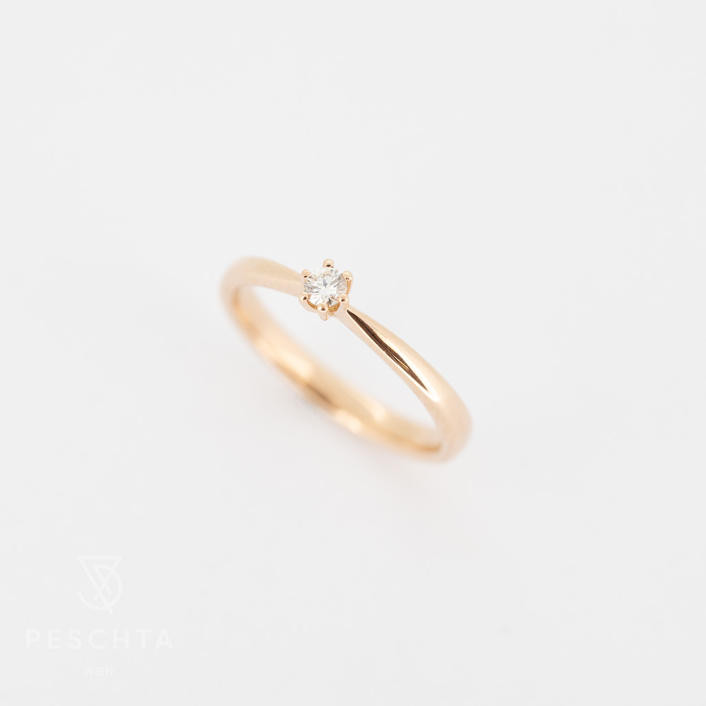 | Beschreibung: | Solitärring aus 14 Karat Roségold, gefasst mit einem Brillanten ( 0,085 Karat). 6 Krappen |