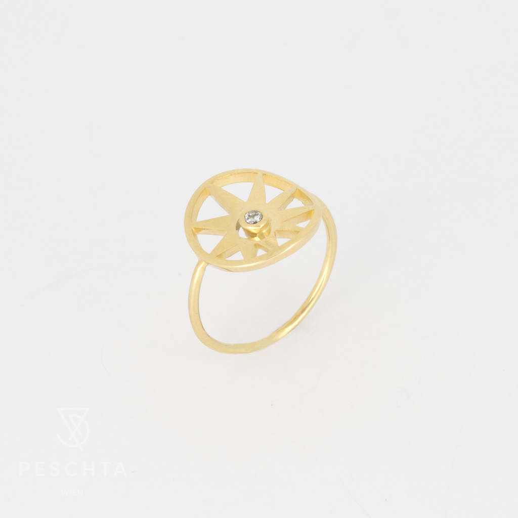 | Beschreibung: | Ring mit einem Stern aus 14 Karat Gelbgold, gefasst mit einem Brillanten (0,04 ct.) |