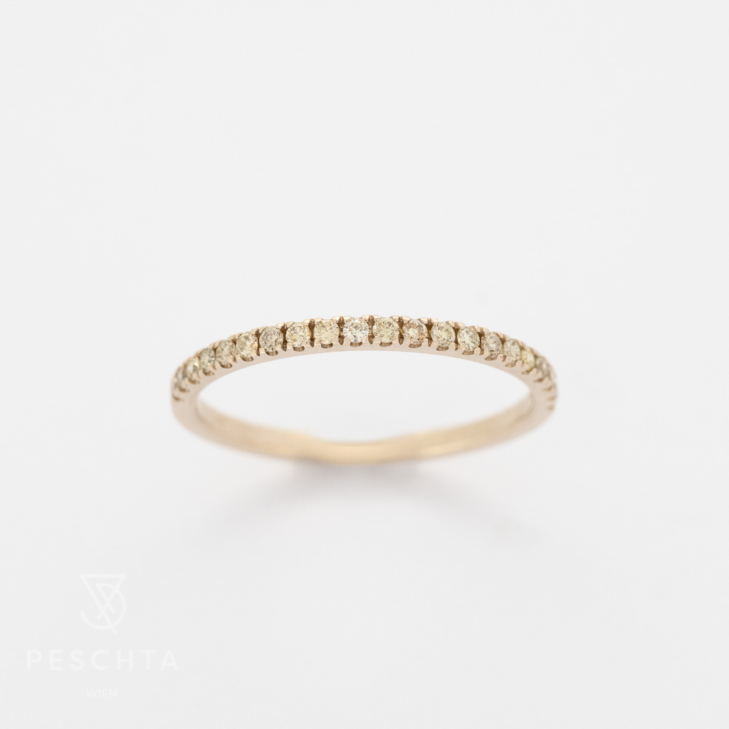 | Beschreibung: | Reihenring aus einem speziell gemischten 14 Karat Weißgold, gefasst mit 21 naturfarbenen Brillanten (gesamt: 0,240 ct.) |