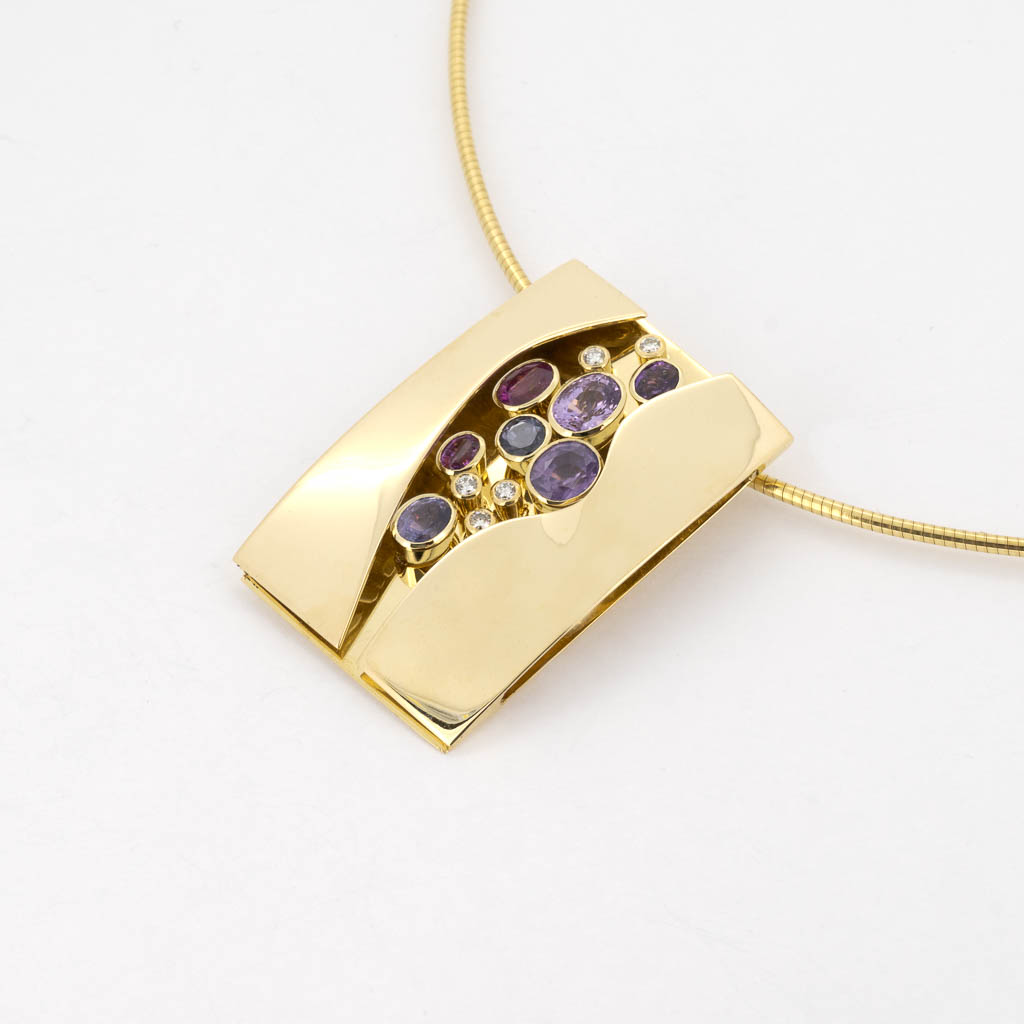 | Beschreibung: | Anhänger aus 14 kt. Gelbgold mit 5 Brillanten 0,03 ct. bis 0,05 ct. und 7 unbehandelte fancy Saphire aus Sri Lanka (ca. 4 ct.) |