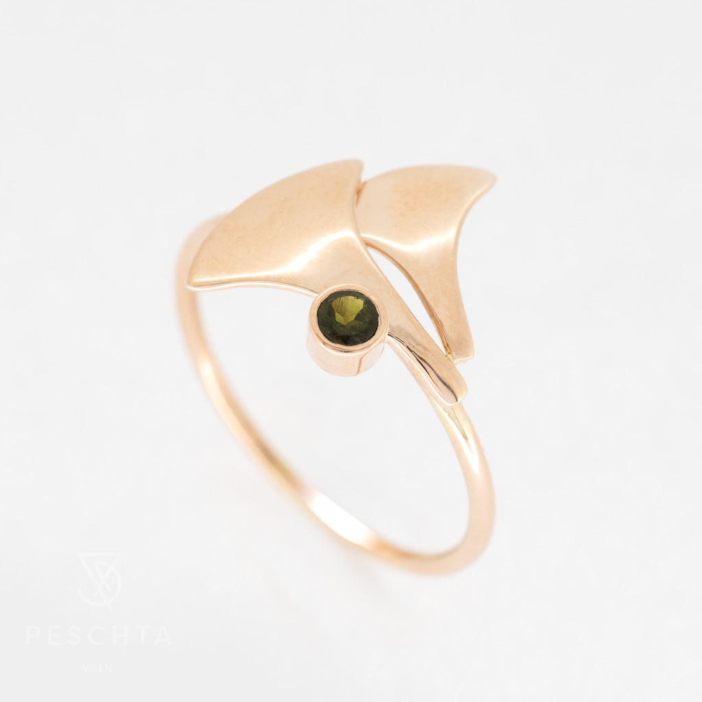 Ring mit Ginkoblätter aus 14 Karat Rosegold, gefasst mit einem grünen Turmalin (Durchmesser: 3 mm)