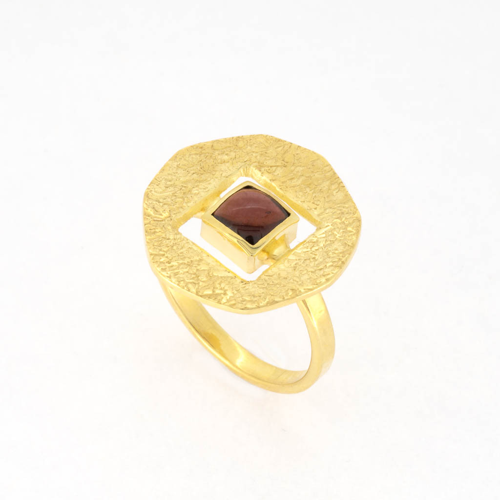 | Beschreibung: | Ring in Silber vergoldet mit einer runden strukturierten Schüssel (Durchmesser 1,8 cm) und einem quadratischen Granat (ca, 4,5 mm x 4,5mm), Ringbreite: 2,3 mm |