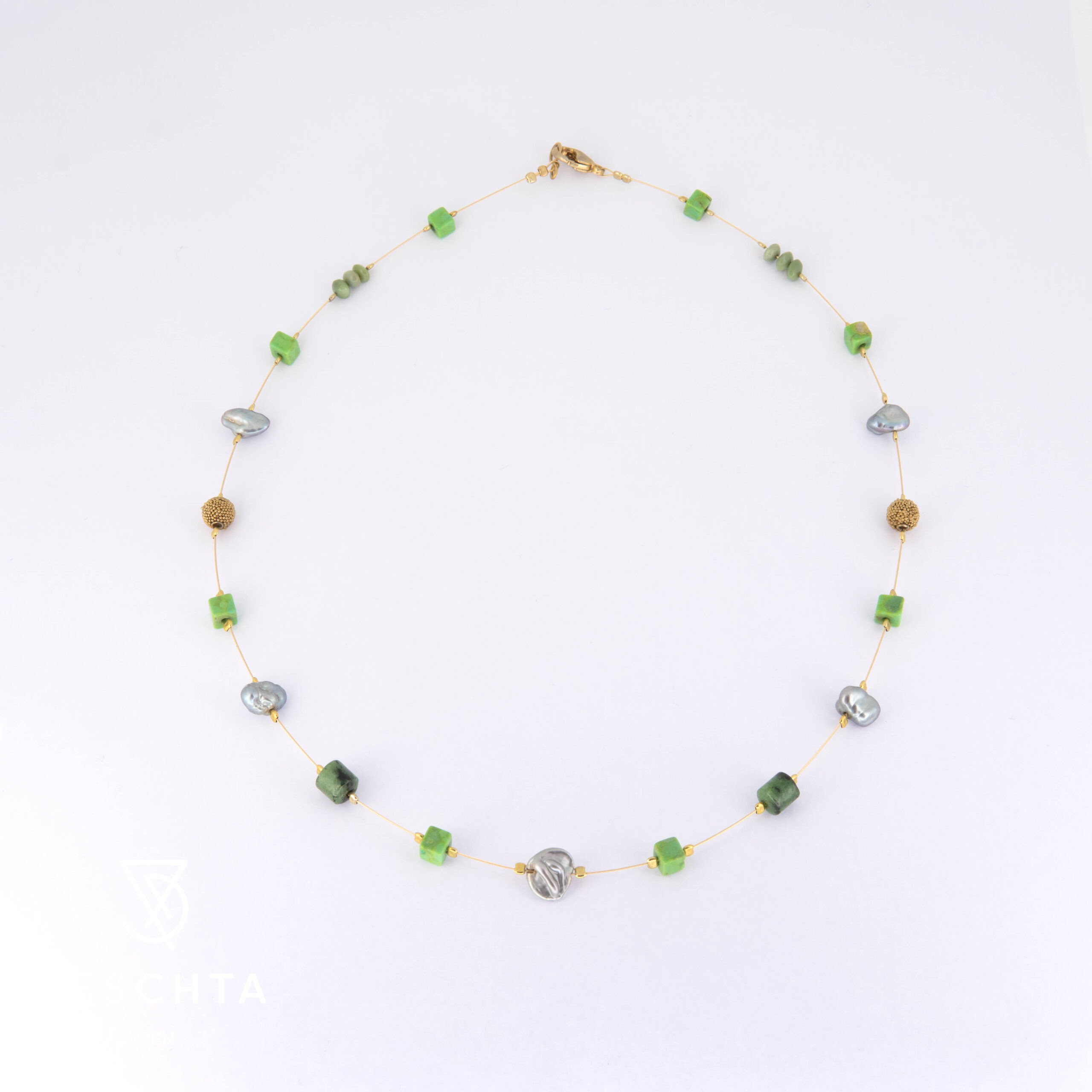 Einreihige Halskette, Silberdraht vergoldet mit grünem Tyrkis (Gaspit) und Perle
