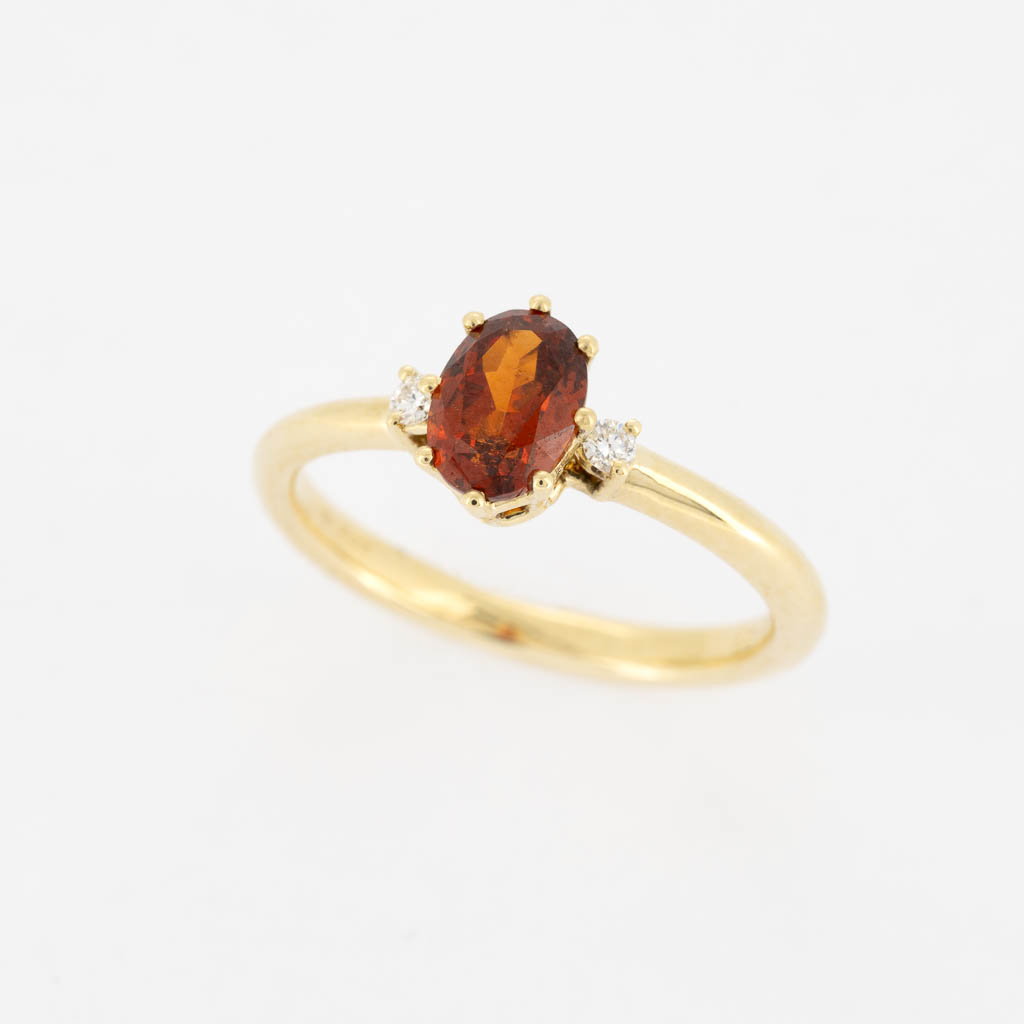 Ring aus 14 kt. Gelbgold mit einem Hessonit (7 mm x 4 mm) und 2 Brillanten (0,05 ct.)