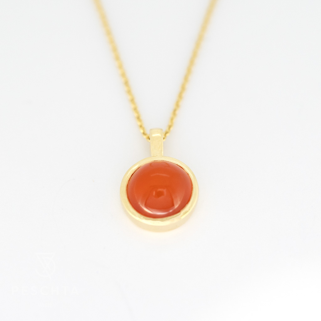 Anhänger aus 14 Karat Gelbgold, gefasst mit einem Karneol (Durchmesser: 1 cm) Einen passenden Ring finden Sie auch in unserem Shop