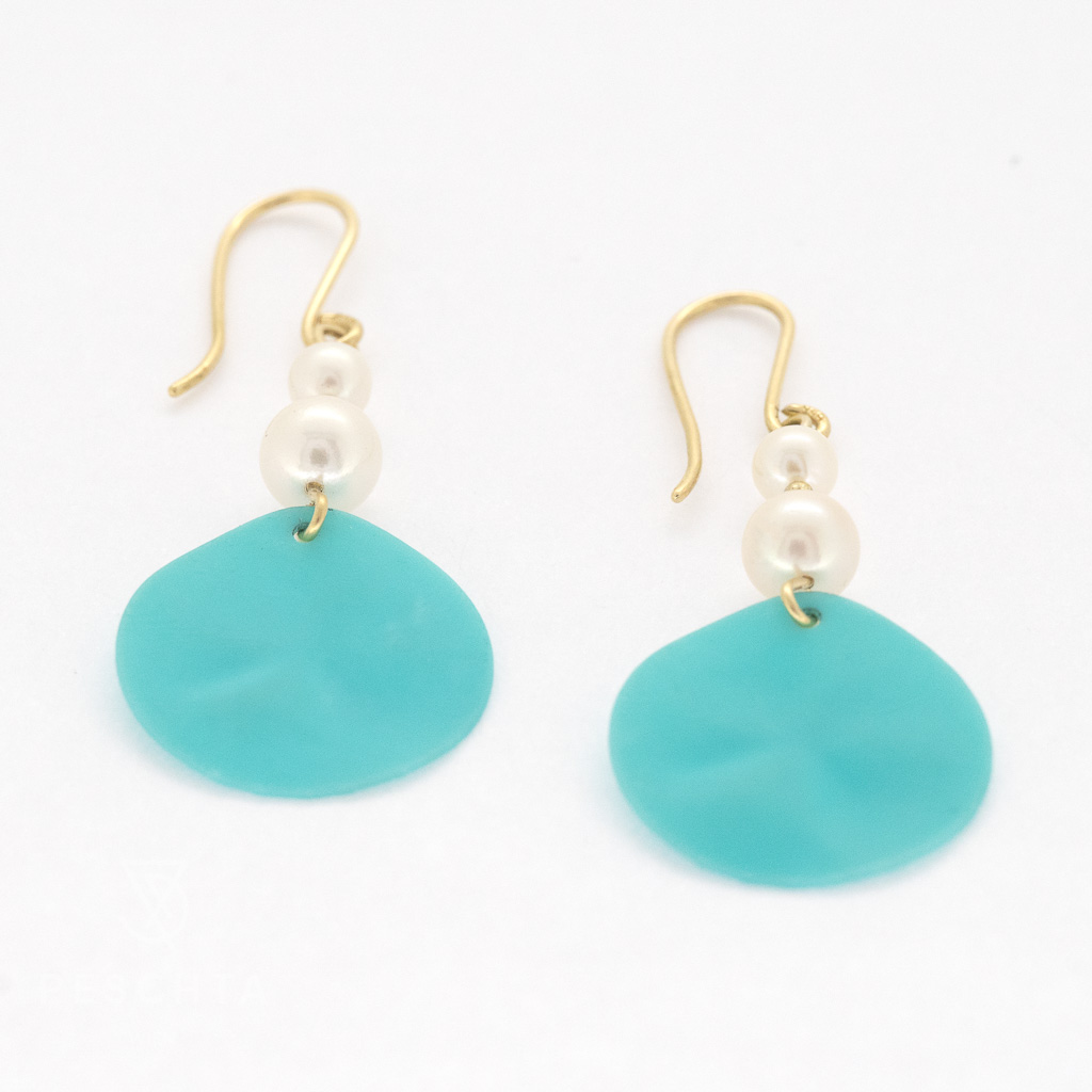 Ohrhänger aus 14 Karat Gelbgold, mit Plättchen aus Keramik und Perlen