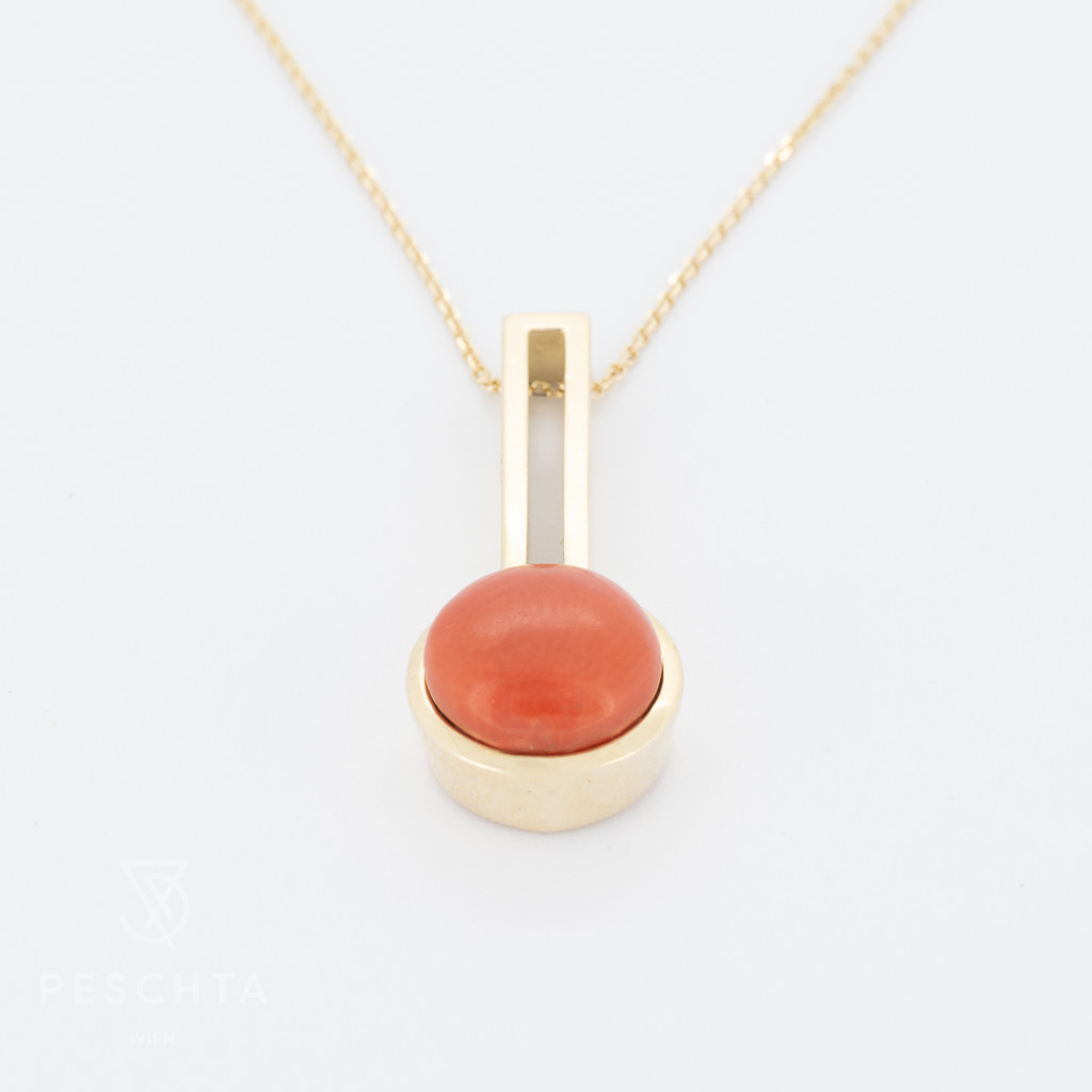 | Beschreibung: | Anhänger aus 14 Karat Gelbgold, gefasst mit einem Korallenbouton |