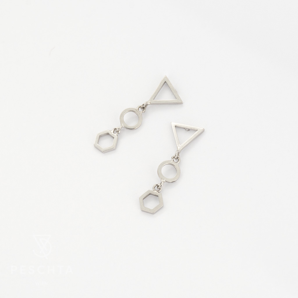 | Beschreibung: | Ohrhänger aus 14 Karat Weißgold mit je 3 Elementen (Dreieck, Kreis, 6-Eck) |