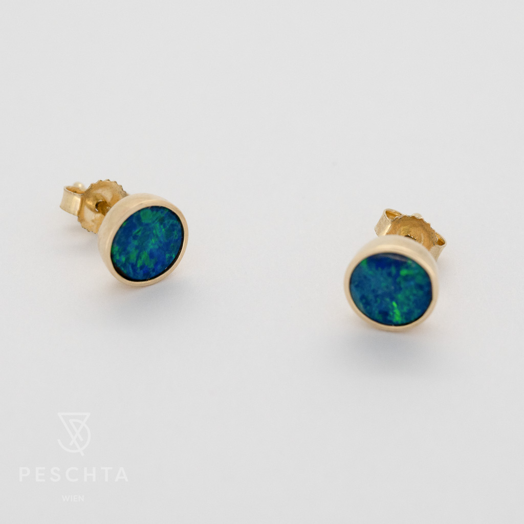 Ohrstecker aus 14 Karat Gelbgold, gefasst mit 2 Opaldoubletten (Durchmesser 6 mm)