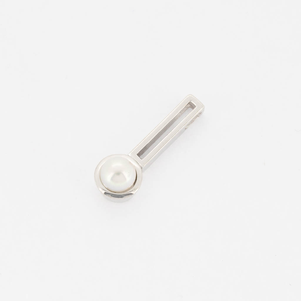 Anhänger aus 14 kt. Weißgolg gefasst mit einer weißen Perle. Die Länge des Anhängers ist 2 cm,