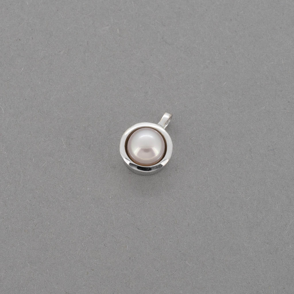 Runder Anhänger aus 14 kt. Weißgold gefasst mit einer rosa Perle. Der Durchmesser des Anhängers ist 7,5 mm.