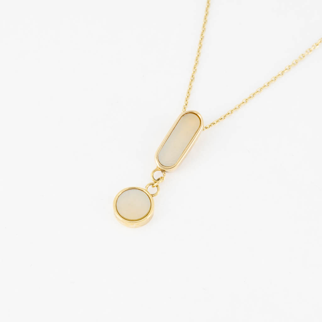 Kettenanhänger in Form eines Rufezeichens aus 14 kt. Gelbgold gefasst mit schimmerndem Perlmutt.