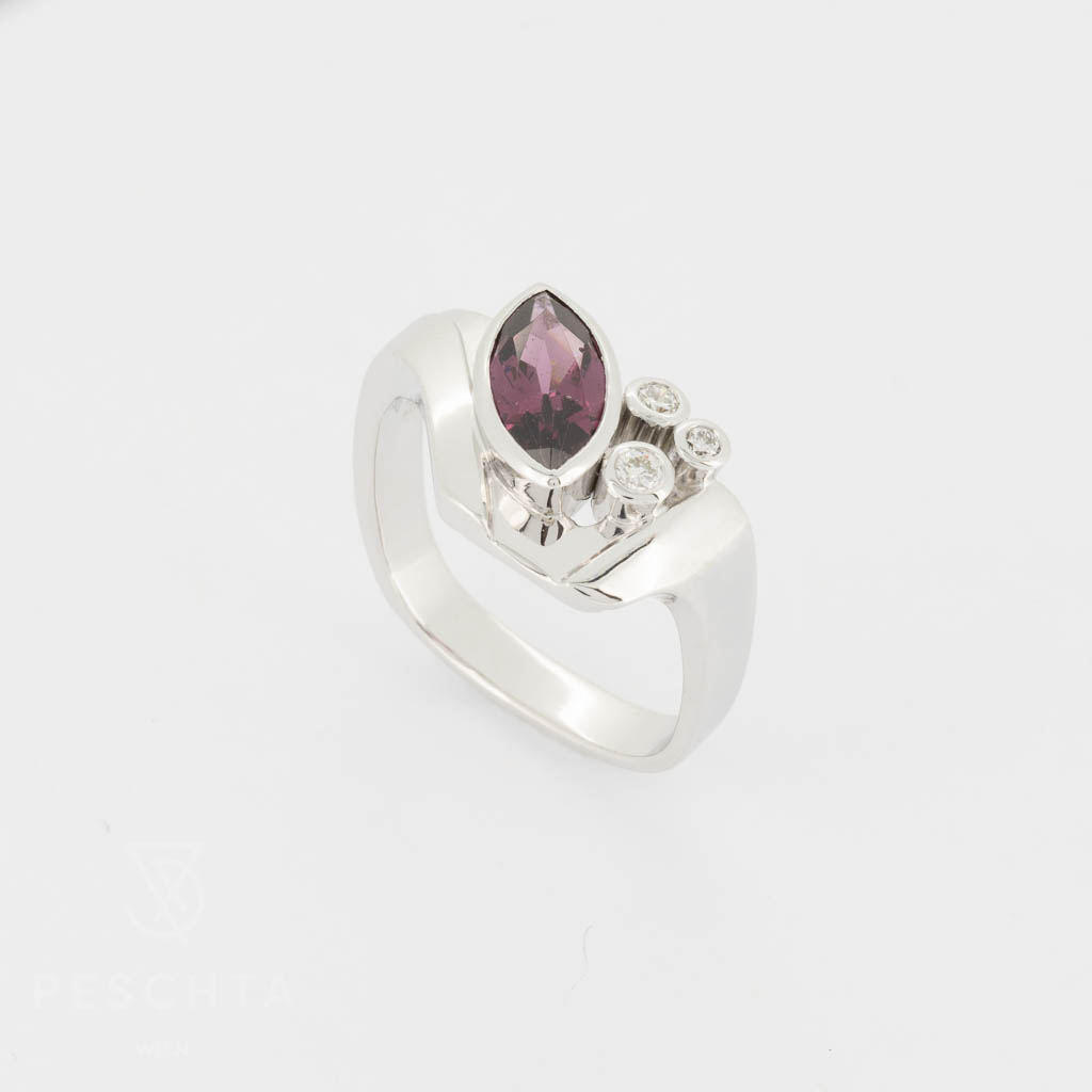 1 Rhodolith Navette 1 cm x 0,5 cm, 3 Brillanten 0,08 ct, Ringbreite: 3 mm