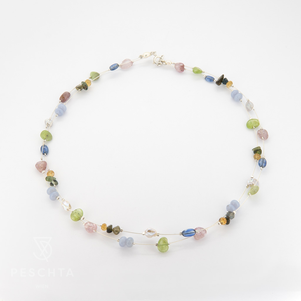 | Beschreibung: | Zweireihige Halskette aus Silberdraht mit Spinell, Peridot, Turmalin, Chalcedon, Kyanit und Perlen |