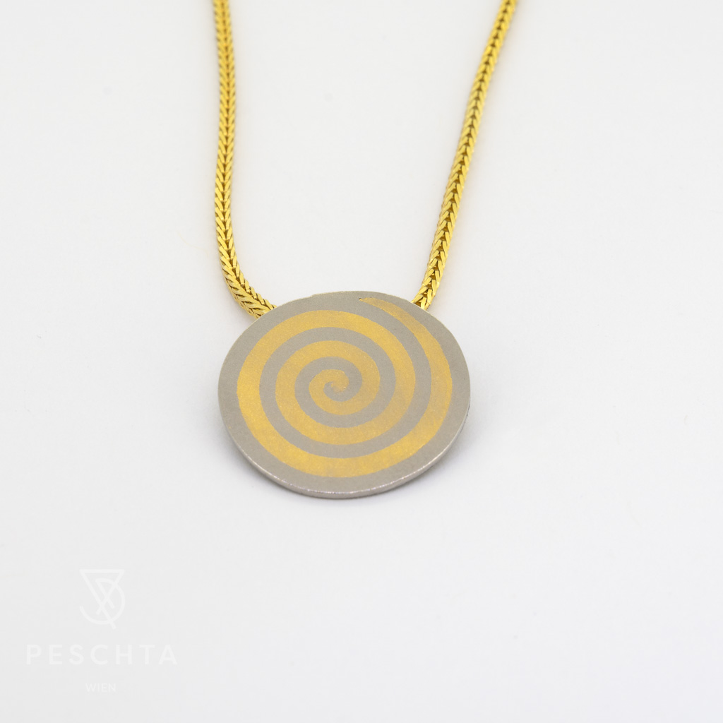 | Beschreibung: | Runder Anhänger aus Feingold ( 24 Karat Gelbgold) und Platin |