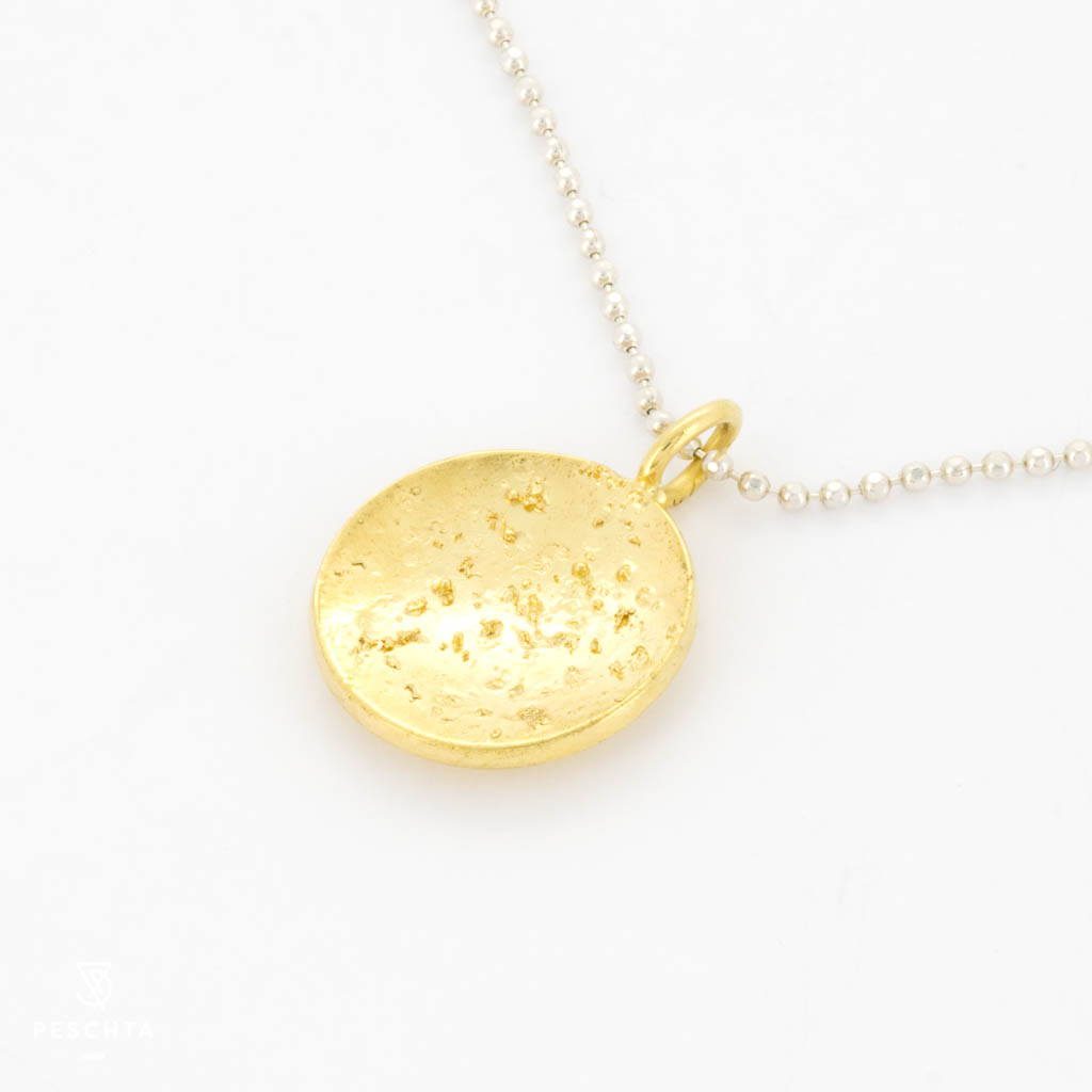 | Beschreibung: | Anhänger in Silber vergoldet mit Struktur – Feilung aufgeschmolzen, Durchmesser: 12 mm |