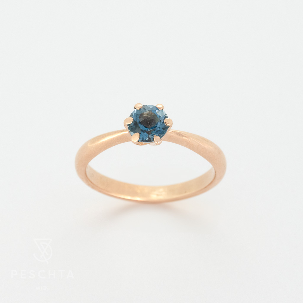 | Beschreibung: | Ring aus 14 Karat Rosegold, gefasst mit einem blauen Topas London Blue |