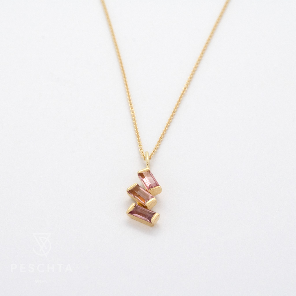 | Beschreibung: | Anhänger aus 18 Karat Gelbgold, gefasst mit 3 Turmalin Baguette |