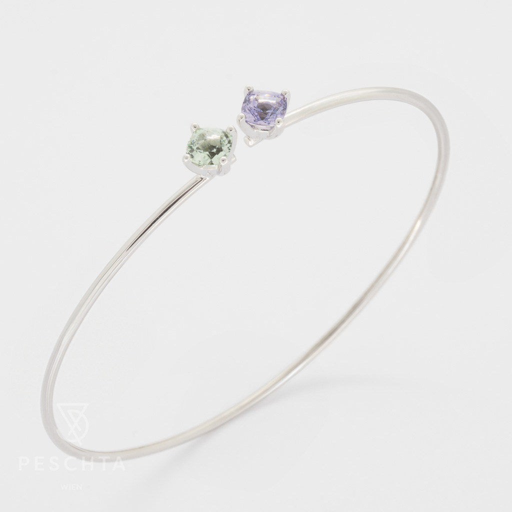 Armreifen aus 18 Karat Palladium Weißgold, gefasst mit 2 antiken Turmalinen flieder und mint (je 5 mm)
