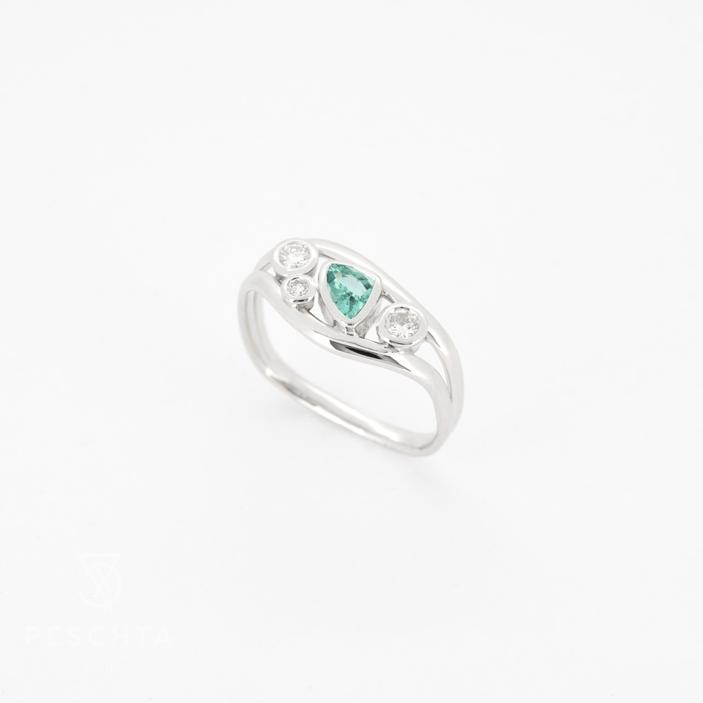 | Beschreibung: | Geschwungener Ring aus 18 Karat Palladium Weißgold, gefasst mit einem Paraibaturmalin (0,45 Karat) und 3 Brillanten (Gesamt: 0,22 Karat) |