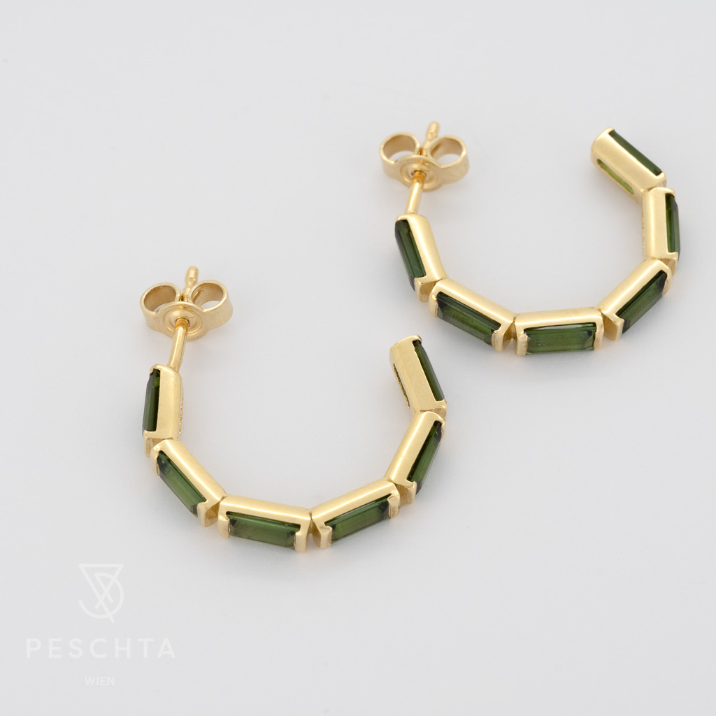 | Beschreibung: | Creolen aus 18 Karat Gelbgold, gefasst mit je 6 grünen Turmalin Baguettes (5 mm x 2,5 mm) |