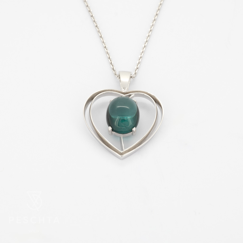| Beschreibung: | Anhänger in Herzform aus 14 Karat Weißgold, gefasst mit einem grünen Turmalin Cabochon (3,33 ct.) |