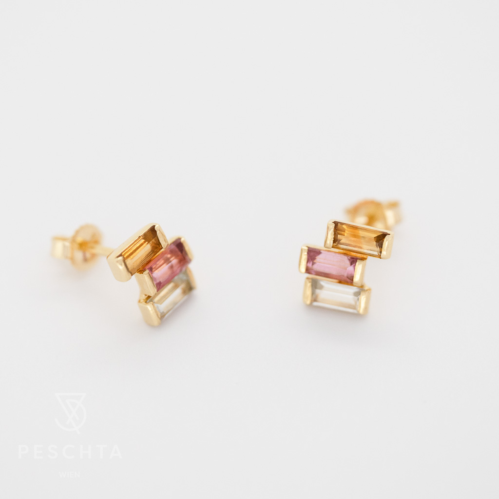 Ohrstecker aus 18 Karat Gelbgold, gefasst mit je 3 Turmalin Baguette (rosa, hellblau, orange) Breite: 6 mm x 8 mm