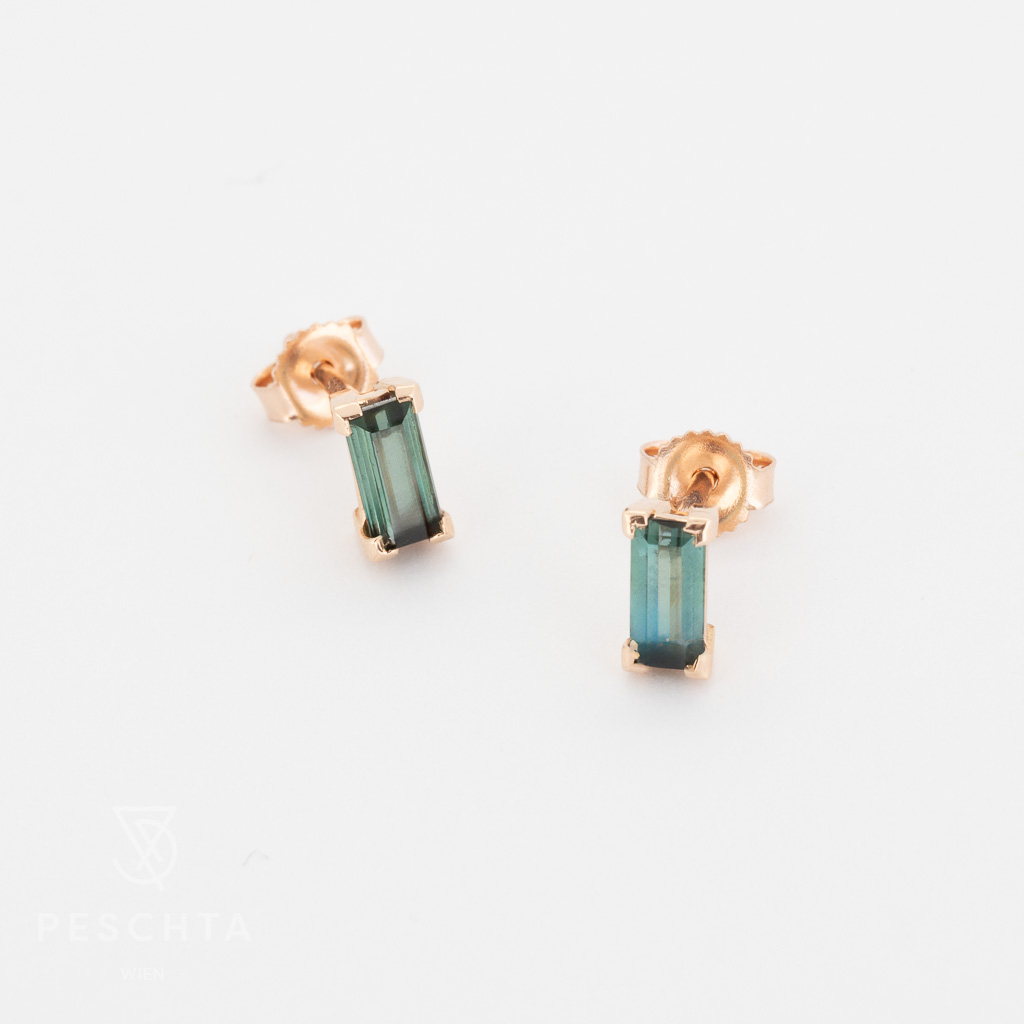 Ohrstecker aus 14 Karat Roségold, gefasst mit je einem grünen Turmalin Baguette (3 mm x 6 mm)